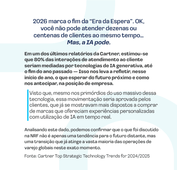 A NRF também mostrou uma evolução clara no papel dos chatbots. Eles deixam de ser respostas automáticas isoladas e passam a atuar como agentes inteligentes, integrados a CRMs, plataformas de dados e times humanos.